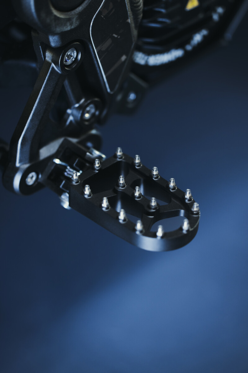 Talaria Sting Pro TL5500 vine echipată cu scări de enduro special concepute pentru a oferi o aderență excelentă în cele mai dificile condiții off-road. Aceste scări sunt realizate prin prelucrare CNC și au o suprafață cu dinți proeminenți, care împiedică alunecarea piciorului chiar și în cele mai noroioase sau umede condiții. Aceste scări de enduro, care erau disponibile anterior doar ca opțiuni suplimentare, sunt acum incluse în dotarea standard a modelului TL5500, asigurând astfel o siguranță și un control îmbunătățit pentru pilot în orice situație.
